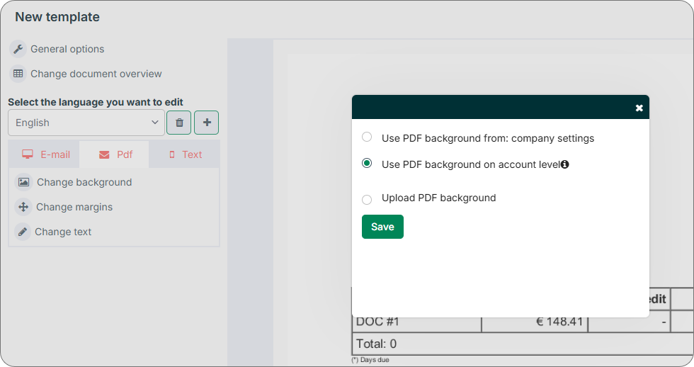 Selecting Use PDF background on account level when configuring template text.