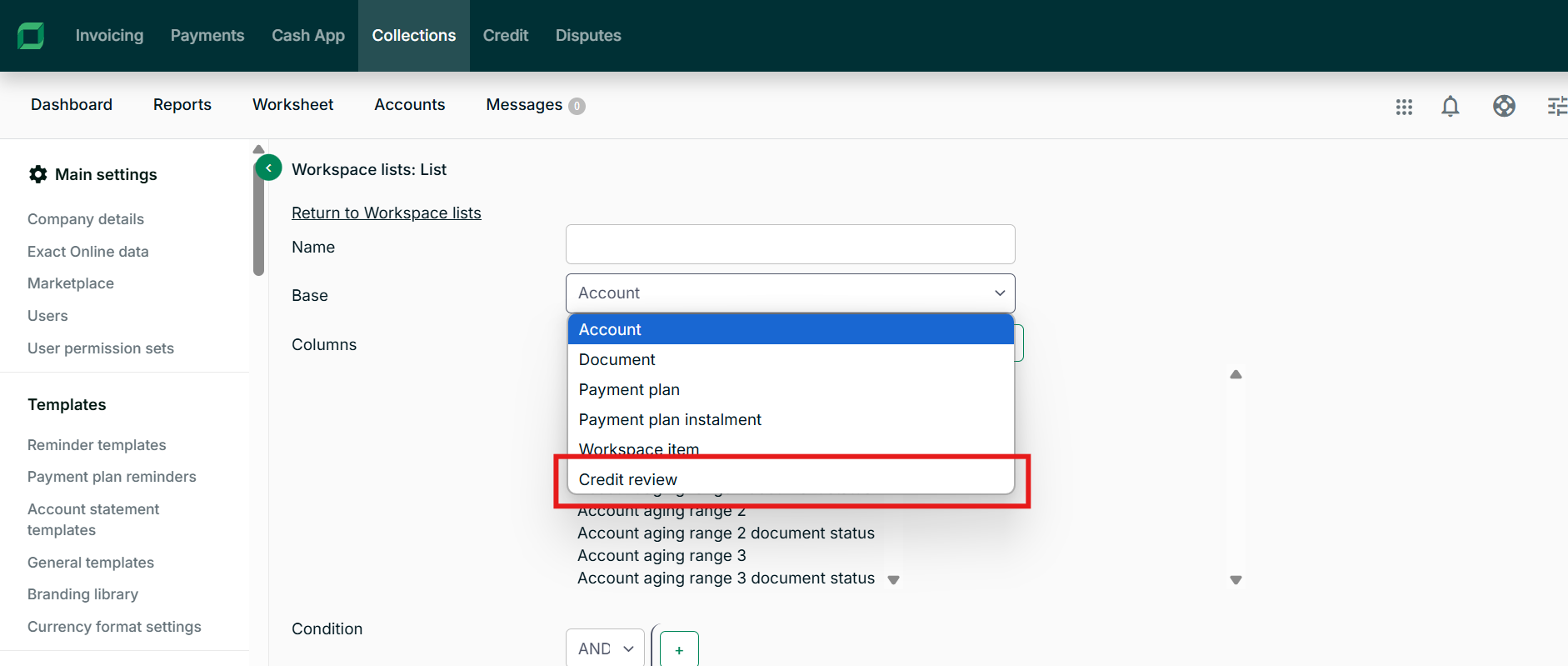 There is one (1) default tracking list you can enable that contains all the accounts with an active credit review. Add the default tracking list in the worksheet settings. The list is named Accounts in credit review. It contains a list of all the accounts that have an active review with the following columns: