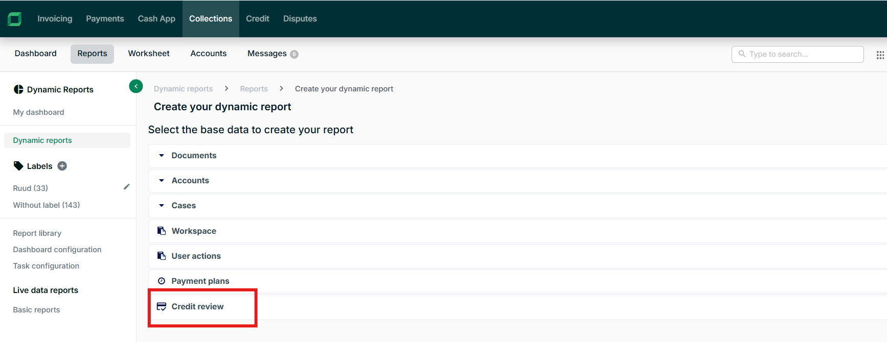 Report on all the active and finished credit reviews by creating a dynamic report with Credit review as the base.
