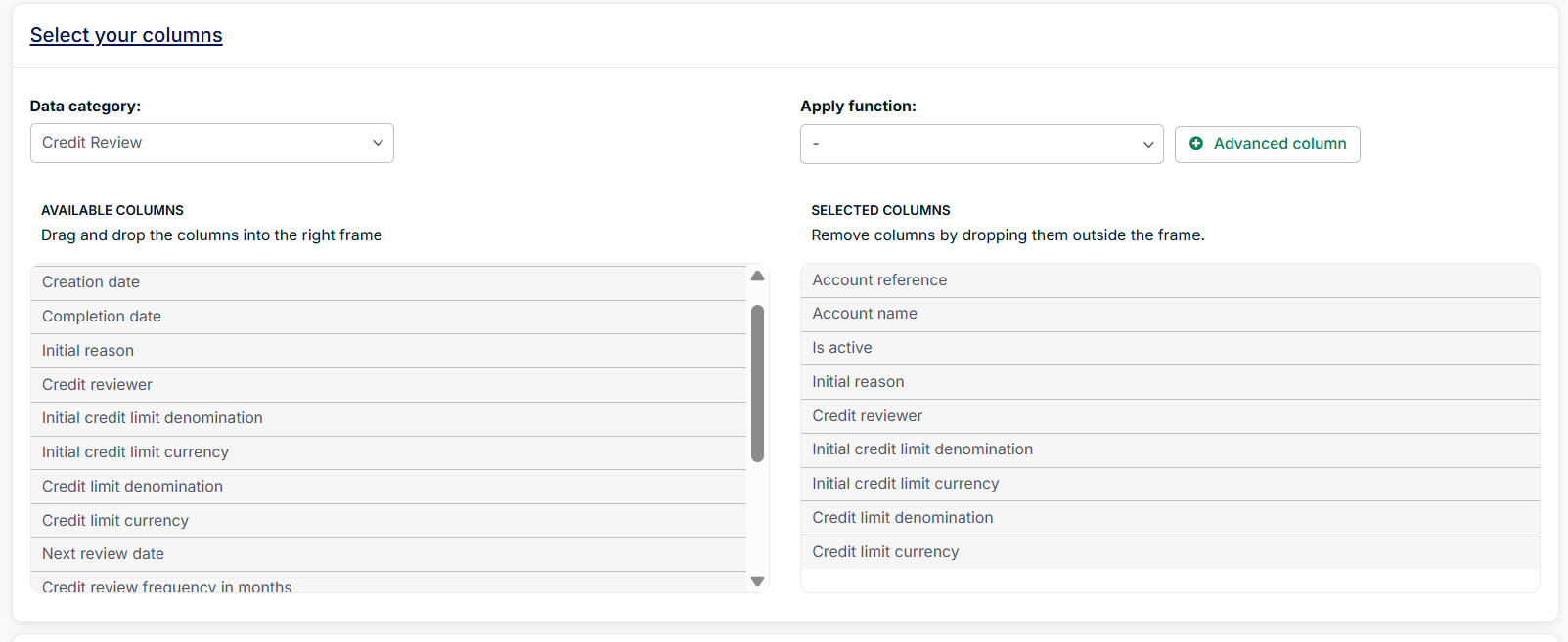 Example of the columns you can select from this reporting category: an import field is the credit limit denomination field. This is the credit limit that is set upon finishing the credit review. This value should flow back into the accounting system of the customer.