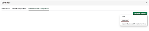 - Select Add New Provider and select CreditSafe from the list of available providers.NOTE